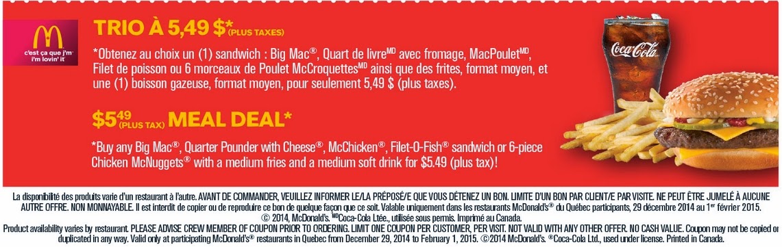 McDonald's a annoncé ces nouveaux coupons rabais qui sont valides du 29 décembre 2014 au 1 février 2015. Il y a 18 coupons rabais disponibles! Avec ces coupons rabais vous allez pouvoir économiser encore plus. Trouvez le lien directe vers les coupons McDonald à imprimer ci-dessous: